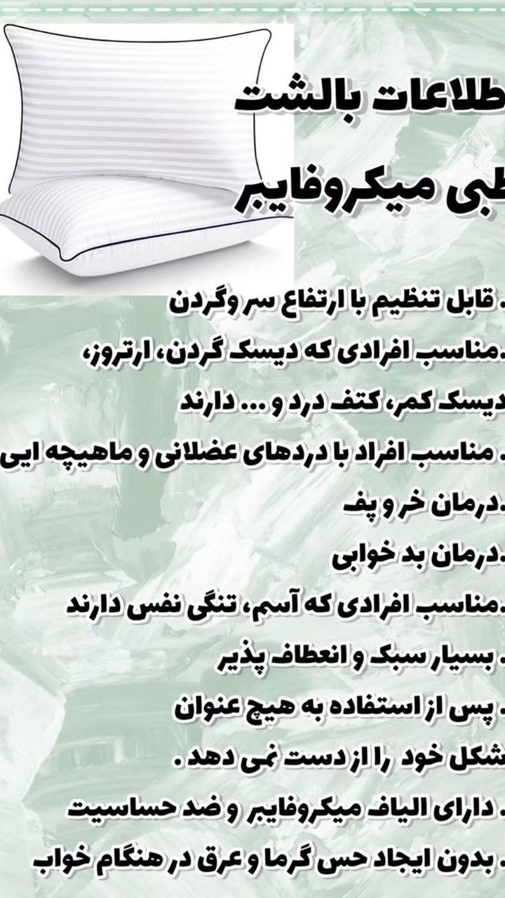 امروزه بالشت های فراوانی با کاربردهای متفاوت در کارخانجات محصولات کالای خواب تولید و روانه بازار می شود. بالشت میکرو فایبر یکی از محصولات بسیار نرم و لطیف بیز می باشد که دارای الیاف میکرو فایبر درجه یک بوده که به دلیل لطافت بالا به الیاف شبه پر معروف است. از ویژگی های این الیاف به شستشوی آسان ، خشک شدن سریع و مقاوم در برابر سایش را می توان ذکر کرد.